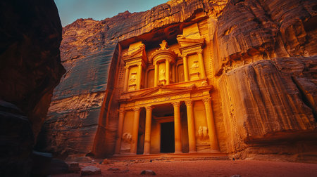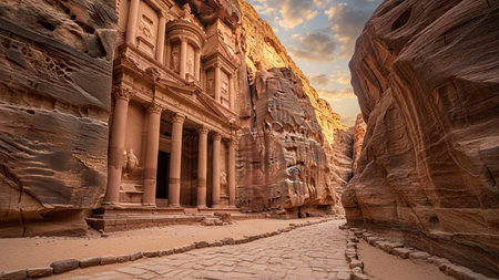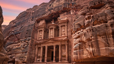Petra Treasury at Sunset in Jordan, Ancient Rock-Cut Architecture in Narrow Canyon, Iconic Historical Landmark Carved in Rose Sandstone