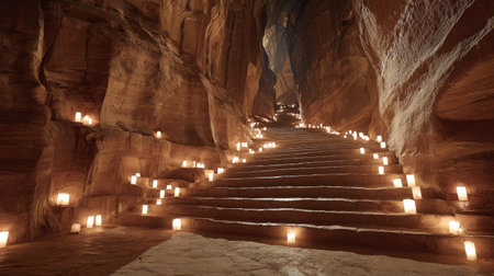 A staircase ascends into a carved rock structure, illuminated by numerous small lights. Warm colors dominate the scene, with a focus on the texture of the stone and the glow of the lights. The composition suggests a night setting, possibly indoors or within a natural cavern. Suitable for editorial and commercial applications.