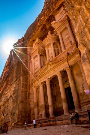 PETRA, JORDAN - JANUARY 30, 2020: Tourists enjoy sunny day at famous temple El-Khazneh, carved in cliffs Petra complex and tourist attraction, Hashemite Kingdom of Jordan, sunlight diffraction