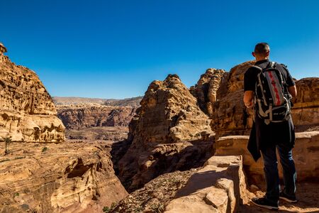 PETRA, JORDAN - JANUARY 30, 2020: Fit male tourist with backpack enjoys views from the scenery Monastery Route, beautiful sunny day at Petra complex and tourist attraction, Hashemite Kingdom of Jordan