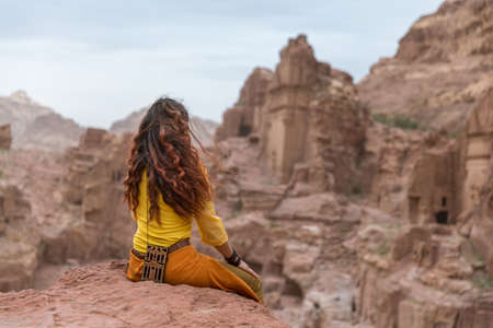 Asian woman traveler sitting on carpet viewpoint in Petra ancient city looking at the Treasury or Al-khazneh, famous travel destination of Jordan and one of seven wonders.