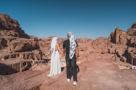 Young couple in love standing on top of Petra ruin and ancient city in Wadi Musa, Jordan, Arab, Asia