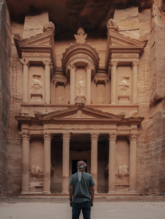 A male in a headscarf standing in front of the historic Petra Wadi in Jordan