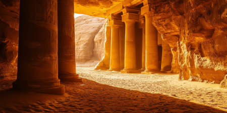 A view of monumental ancient architecture carved into towering sandstone cliffs. The image displays warm tones with golden sunlight enhancing textures. The composition captures the entrance of a building, and the surroundings suggest a natural, arid environment. Suitable for commercial projects or historical editorials.