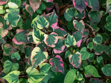 Chameleon plant (Houttuynia cordata) 'Variegata' with green leaves beautifully variegated with shades of red, pink, yellow or cream growing in park in autumn