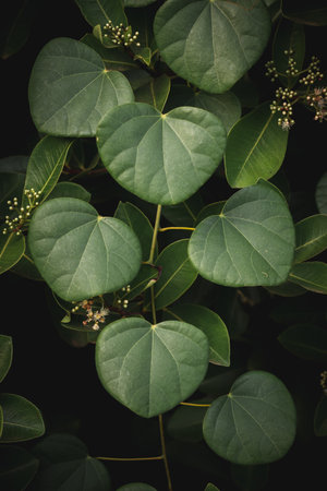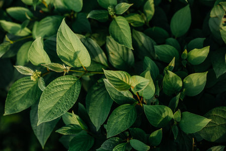 Closeup of lush dark green leaves of capers on natural background. Natural botanical background with copy space
