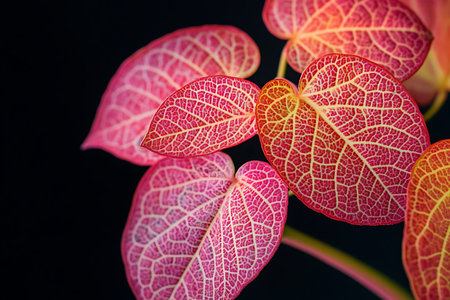 Striking macro image showcases the unique foliage of iresine herbstii, highlighting the contrast between pink and yellow hues and the detailed network of leaf veins against black backdrop.