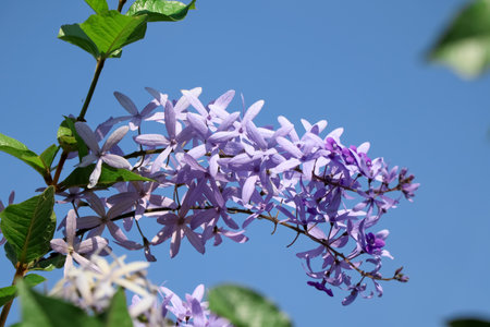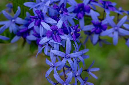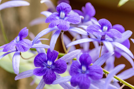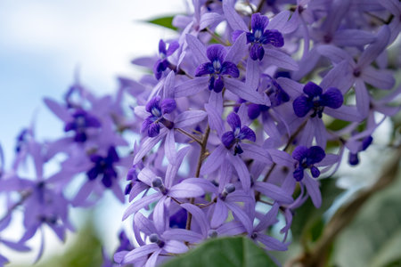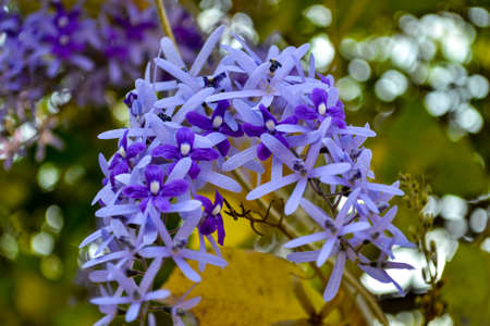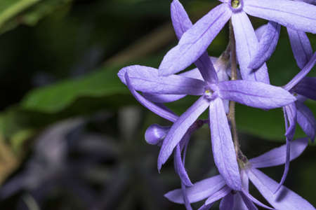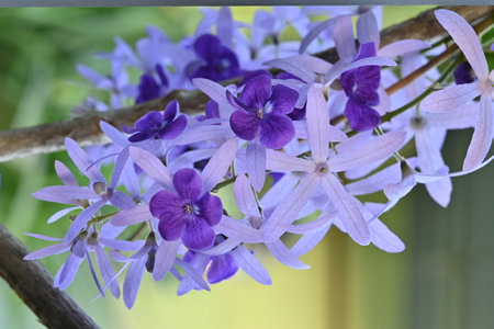 Cluster of beautiful lavender - blue flowers of Petrea Volubilis. The true flower is feve - lobed petals that is surrounded by the five - lobed petal - like calyces.