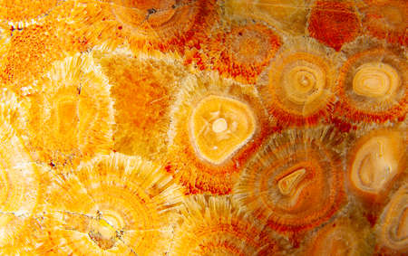 Full-screen close-up texture of petrified coral with red-blue agate in the cells. Natural stone background.