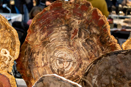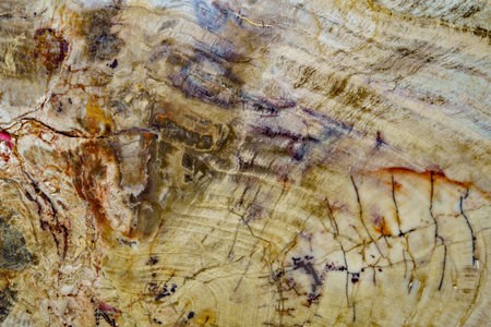 Patterns in a cut and polished slab of fossilized wood, close up.