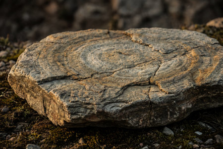 A thick, rustic stone slab rests on mossy ground, its surface adorned with intricate, natural patterns and markings, illuminated by soft cinematic lighting emphasizing its textured geological formation