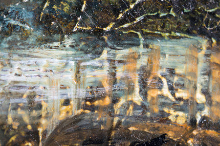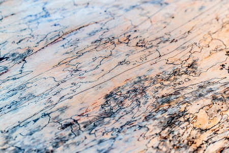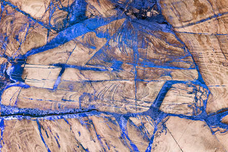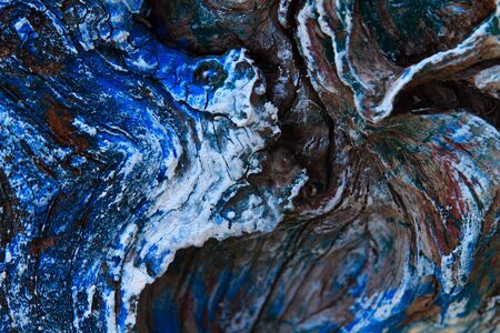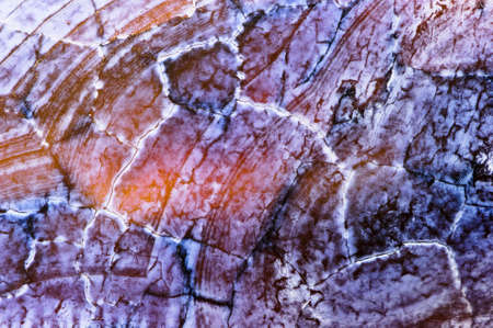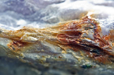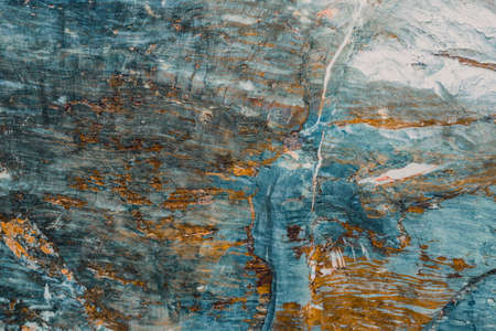 Agate stone texture with cracks surface of natural unpolished mineral in blue and orange tint macro shot abstract background selective focus