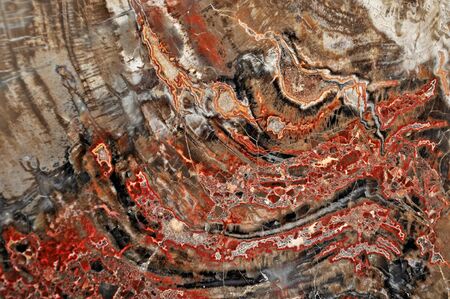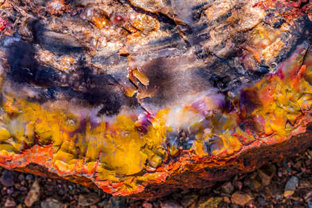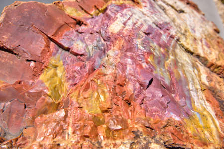 Petrified Wood close up, colorful shades of red, orange, purple, yellow and grey example of fossilized mineralization and permineralization and replacement, along the Escalante Petrified Forest State