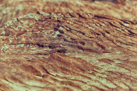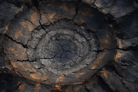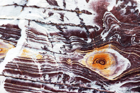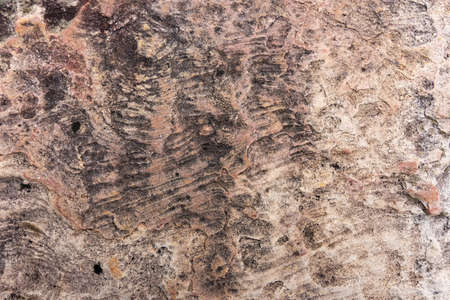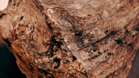 Closeup of the brown wood texture of a tree stump reveals intricate patterns resembling a geological phenomenon, similar to the formation of bedrock on a road surface