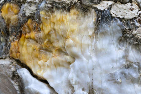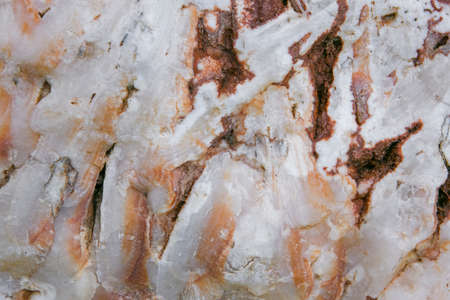 Diverse colored quartz rock in cut of earth. Deposits of gray, white, orange quartz. Untreated semi-precious stones of the chalcedony variety in various stone deposits and layers of different rocks.