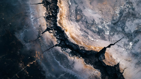 Stark aerial landscape showing jagged fault lines splitting rocky terrain, exposing geological forces carving dramatic tectonic patterns across desolate ground