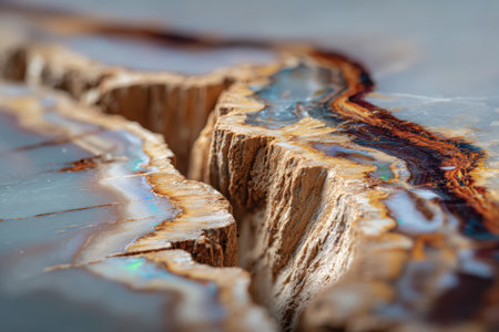 A detailed close up shows a split rock formation. The rock exhibits layers of colorful mineral deposits. The split creates a canyon like appearance, highlighting the texture and erosion of the stone. The image captures the beauty of nature.
