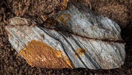 Rock Erosion texture over the time. Geographical Metamorphic rock with faults undergoing transformation from Igneous Rock to Sedimentary Rock, and will further erode to soil.