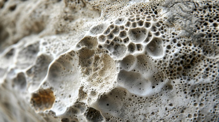 Macro view of a porous white rock with many holes and intricate natural formations