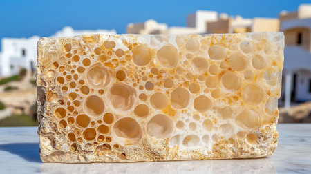 Rectangular piece of carved stone exhibiting a repeating pattern of irregular, interconnected, rounded cavities. The stone's surface is a mix of light beige and pale yellow hues, showcasing a rich, natural texture. The stone is positioned on a marble surface with buildings in the background.