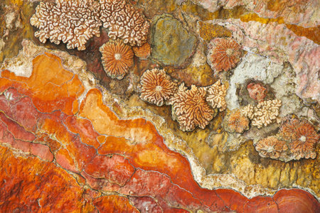 Textured coral reef, vibrant orange and red formations with intricate natural patterns, exotic and aquatic