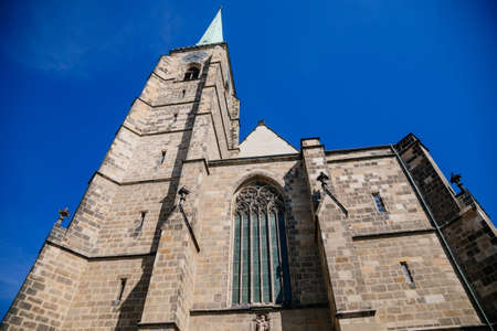 St. Bartholomew's Cathedral on the main Republic square of Plzen, Gothic church in old town in sunny day, Pilsen, Western Bohemia, Czech Republic, August 1, 2020