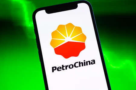 Poltava, Ukraine - May 9, 2022: Index of PetroChina oil prices, logo close-up. Green stock market graph background. Gasoline and energy industry concept photo