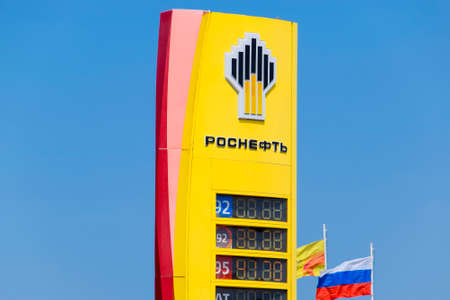 Petrovskaya, Russia - August 20, 2017: Gas station of the oil company Rosneft on the highway. Logo of the company Rosneft