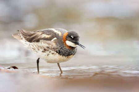 Close up of a Red-necked phalarope (Phalaropus lobatus) feeding in water, Iceland.