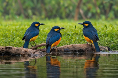 Two striking birds with black, orange, and white plumage sit closely together on a branch. They are surrounded by lush greenery, showcasing their vivid colors against a soft, naturally blurred background.