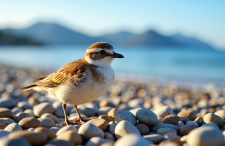 A small bird with brown and white feathers stands on smooth pebbles along a lakeshore or seaside, with distant mountains and calm water under a clear sky, capturing a peaceful natural scene perfect for nature or wildlife themes