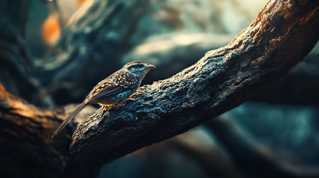 a small bird perched on a vibrant backdrop featuring shades of dark azure and amber. captured using the canon ts-e 17mm f4l tilt-shift lens, the photo showcases intricate organic stone carvings in hues of dark orange and dark aquamarine. the multilayered realism and nature-inspired camouflage create a visually stunning and high-quality image. ai generated