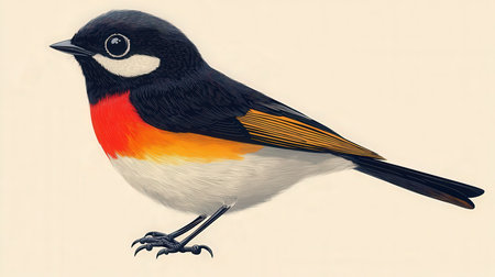 the american redstart, a vibrant warbler, is reimagined as a lifelike 3d character with comically bulging eyes, blending hyper-realistic sci-fi elements with the subtle emotional expressions reminiscent of the barbizon school, while incorporating felt creations and overexposure to add tactile texture and profound depth to this whimsical avian portrait. ai generated