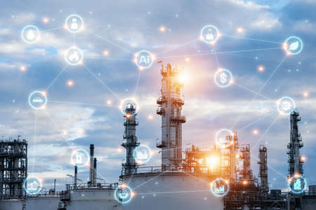 Petrochemical refinery plant. Industrial towers at oil refinery. Oil refinery twilight on classic blue sky background.