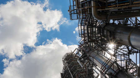 The main distillation column of oil and petroleum products in close-up with copyspace