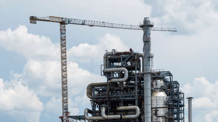 Oil refinery or petroleum refinery plant. Power and energy industry. Oil and gas production plant. Petrochemical plant. Chemical pipeline. Natural gas storage tank with sky. Petroleum engineering.