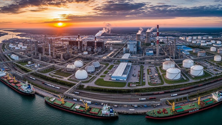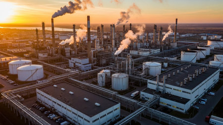 Aerial view of Oil and gas industry - refinery at twilight with chemical storage tank. Fuel and power generation, petrochemical factory industry, or environmental pollution concept