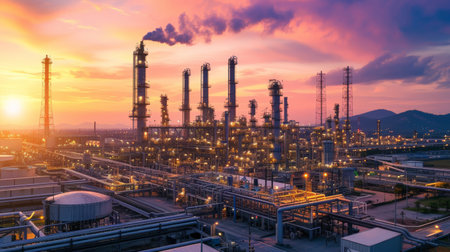 A striking view of an industrial refinery at sunset, silhouetted against a colorful sky. The image showcases smoke stacks and machinery, highlighting energy production.