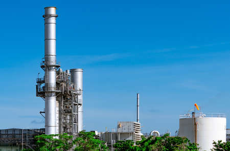 Gas turbine electrical power plant. Energy for support factory in industrial estate. Natural gas tank. Small gas power plant. Power plant using natural gas for fuel. Green energy. Generate electricity