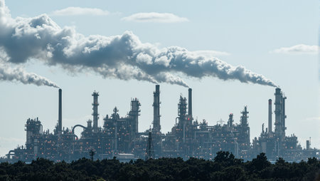 Industrial oil refinery emitting clouds of smoke against polluted sky