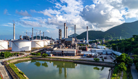 An aerial perspective showcasing a complex industrial plant and oil refinery, highlighting storage tanks and extensive piping systems in an urban setting.