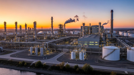 Industrial Power: An Oil Refinery Complex Against a Dramatic Sunset Sky