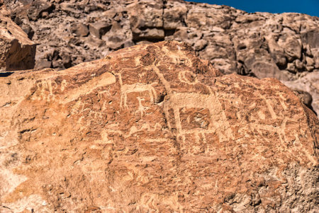 Petroglyphic images of animals on the Graffiti Rock (Qaryat al Asba), Musayqirah, Riyadh Province