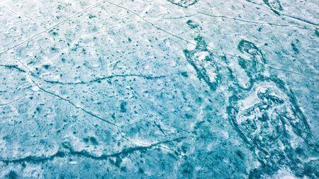 Blue Ice surface of Frozen Lake from drone aerial view at Pangong Lake or Pangong Tso, Tso moriri – Nubra, India. Abstract concept of Cold winter, peaceful and freedom.