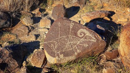 1,000 year old petroglyph carved into rock at Three Rivers Petroglyph Site in New Mexico