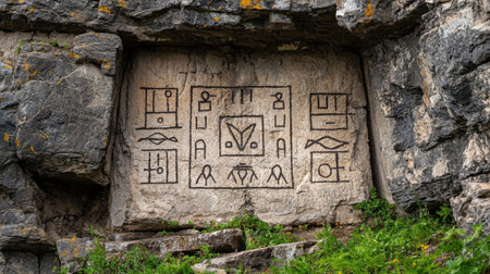 Captivating ancient rock carvings featuring mysterious symbols and figures etched into a cliff face, surrounded by lush greenery and natural stone formations.