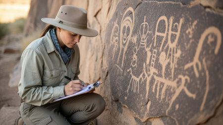 Female explorer documenting petroglyphs on ancient rock surface.