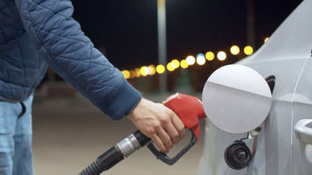 Man Handle pumping gasoline fuel nozzle to refuel. Vehicle fueling facility at petrol station. White car at gas station being filled with fuel. Transportation and ownership concept.