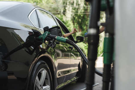 Black fuel nozzle filling high energy power fuel into auto car tank in petrol station, commercial service for benzine, diesel, gasohol, gasoline.