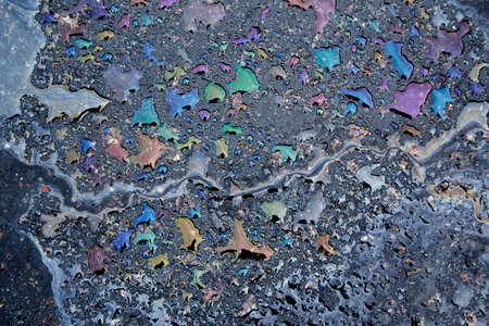 Color Gasoline fuel spots on Asphalt Road as Texture or Background. Environmental pollution concept